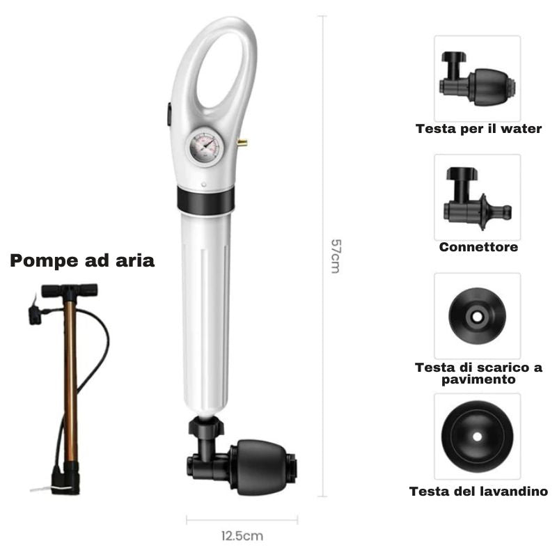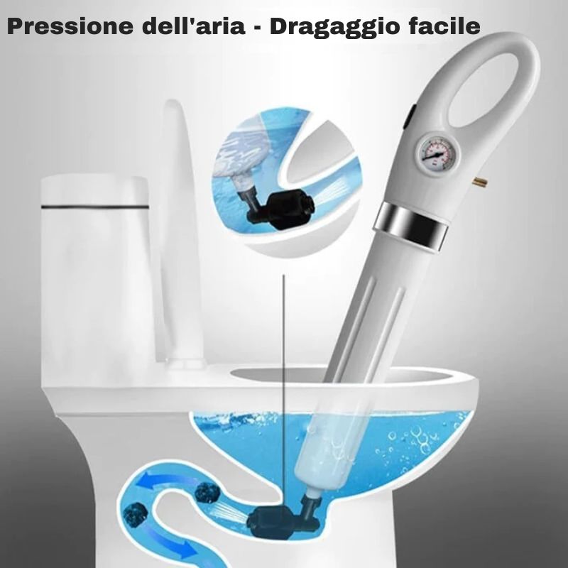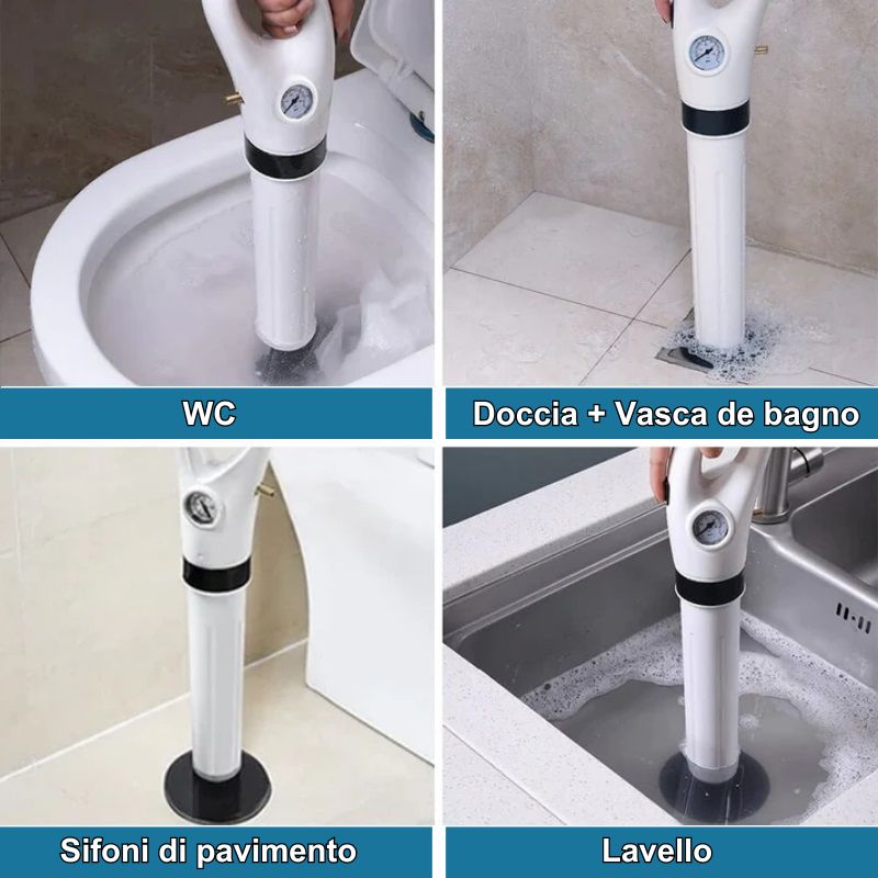 Lo sturatore utilizza un sistema a pompa d’aria compressa per generare una pressione mirata che viene rilasciata direttamente nello scarico. Questo getto d’aria ad alta pressione rimuove efficacemente gli ostruzioni, consentendo all'acqua di fluire liberamente.