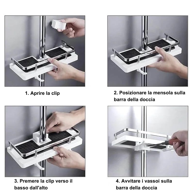 La nostra mensola si aggancia alla barra della doccia con le sue estremità universali, garantendo un'installazione semplice e rapida su tutte le barre della doccia.